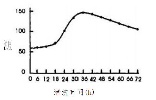 由圖1可知,加入GR-958后,循環水濁度開始增加。清洗到18h后,濁度呈快速增加趨勢,說明粘泥中的微生物在GR-958作用下失去活性,污泥粘性下降,開始大量分散進入水中。清洗到36h時,濁度從開始時的62mg/L增加到156mg/L,40h后,濁度開始緩慢下降,系統生物粘泥基本洗凈。