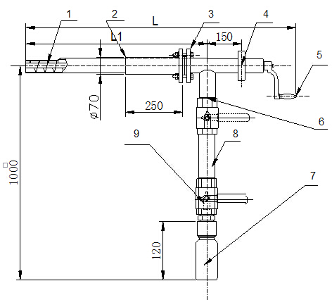 1、取樣嘴2、安裝連接管3、連接法蘭4、組裝密封法蘭5、手柄6、9、球閥7、取樣瓶8、煤粉沉落管。