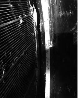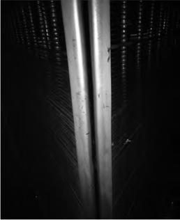 在機(jī)組C修中,通過液壓千斤頂對(duì)收球網(wǎng)網(wǎng)板進(jìn)行初步固定,同時(shí)利用乙炔焰配合大錘敲擊進(jìn)行網(wǎng)板形狀矯正,通過火烤、捶打和液壓裝置固定等矯正手段,使得修后收球網(wǎng)網(wǎng)板的中間間隙均小于2mm,如圖5所示,保證了運(yùn)行期間膠球不會(huì)通過間隙漏至長(zhǎng)江。