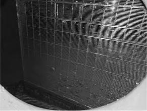 由于長(zhǎng)江下游汛期水草雜物多,若循環(huán)水旋轉(zhuǎn)濾網(wǎng)網(wǎng)板間間隙較大會(huì)導(dǎo)致雜物覆蓋收球網(wǎng),嚴(yán)重時(shí)會(huì)導(dǎo)致收球網(wǎng)變形甚至軸承抱死,收球網(wǎng)無法開啟和關(guān)閉到位,從而導(dǎo)致收球率較低。如圖3、4所示,某電廠收球網(wǎng)變形后會(huì)導(dǎo)致收球網(wǎng)網(wǎng)板關(guān)閉不嚴(yán),在收球的過程中,膠球不僅會(huì)通過收球網(wǎng)網(wǎng)板間的間隙漏出,還會(huì)通過收球網(wǎng)與循環(huán)水管壁的間隙漏出,導(dǎo)致收球率較低。