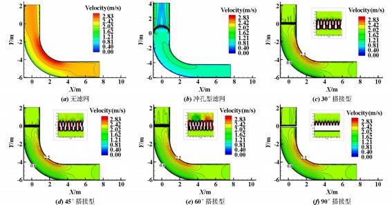 圖3循環水管道中心截面處速度分布云圖由圖3(c)~圖3(f)可以看出安裝二次濾網時的整流效果與沖孔型濾網截然不同安裝30°和45°搭接角度的二次濾網時濾網后水流速度分布狀態基本未受影響安裝60°搭接角度的二次濾網時濾網后水流速度分布狀態受到影響的范圍廣安裝90°搭接角度的二次濾網時管道內、外側水流速度分布相差極大