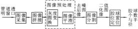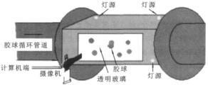自動(dòng)監(jiān)測系統(tǒng)示意圖如圖1所示。該系統(tǒng)可以自動(dòng)地監(jiān)測回收膠球的數(shù)量及其半徑,這樣運(yùn)行人員就可以根據(jù)檢測結(jié)果適時(shí)地添加或更換膠球,保證膠球的數(shù)量以及質(zhì)量,以期達(dá)到佳的清洗效果。通過多次試驗(yàn),攝像機(jī)的佳有效位置及其范圍得以確定,并根據(jù)強(qiáng)度承受力和光照特點(diǎn)選擇了合適的材料。本系統(tǒng)硬件配置如圖2所示,其中透明管道材料為鑄造鋼、光學(xué)玻璃,管道內(nèi)側(cè)不同角度裝有頻閃燈,攝像機(jī)拍攝角度垂直于密封玻璃面,拍攝焦距可調(diào)。